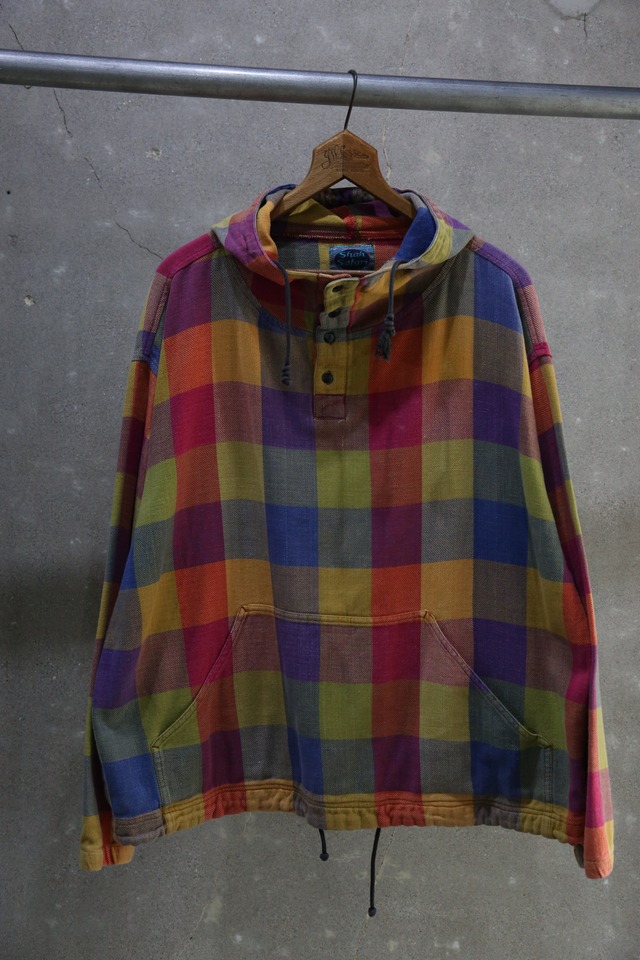 【shah safari】 ヘンリーネックスウェットフーディー 厚すぎない柔らかいフランネル生地 マルチカラーのブロックチェック 裾、袖ゴムリブ フード、裾紐 ほつれ、汚れあり 年代: 1990年代頃 素材:コットン100% カラー:マルチ サイズ表記 :BIG(恐らくキッズ規格のものかと) ー実寸(約cm)ー 肩幅:58.5 身幅:63.5 袖丈:55.5 着丈:65 th070366