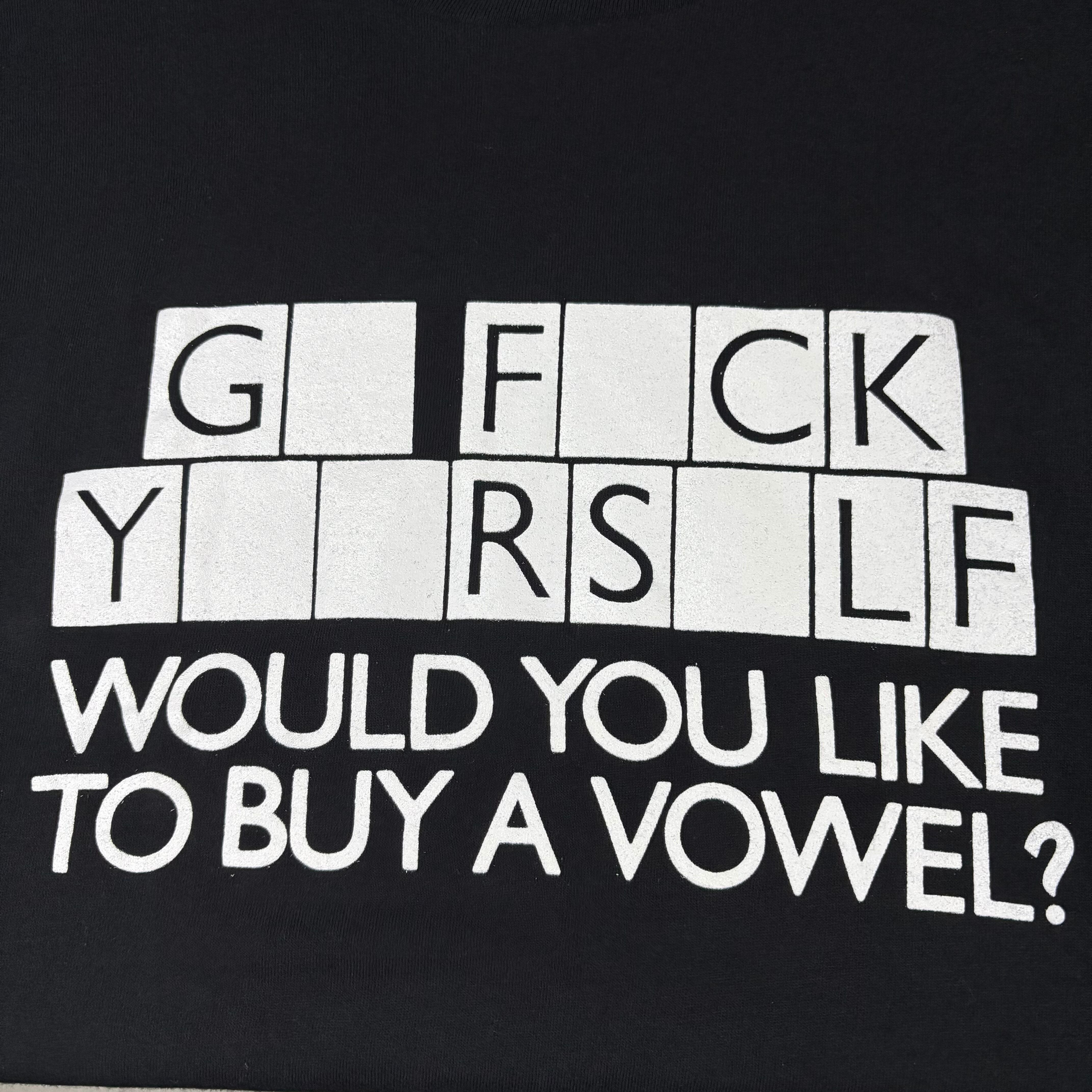 アメリカのテレビ番組でも『Wheel of Fortune』のような穴埋め形式のクイズが人気ですが、このTシャツもそのノリを感じるどこかアメリカらしいプリント