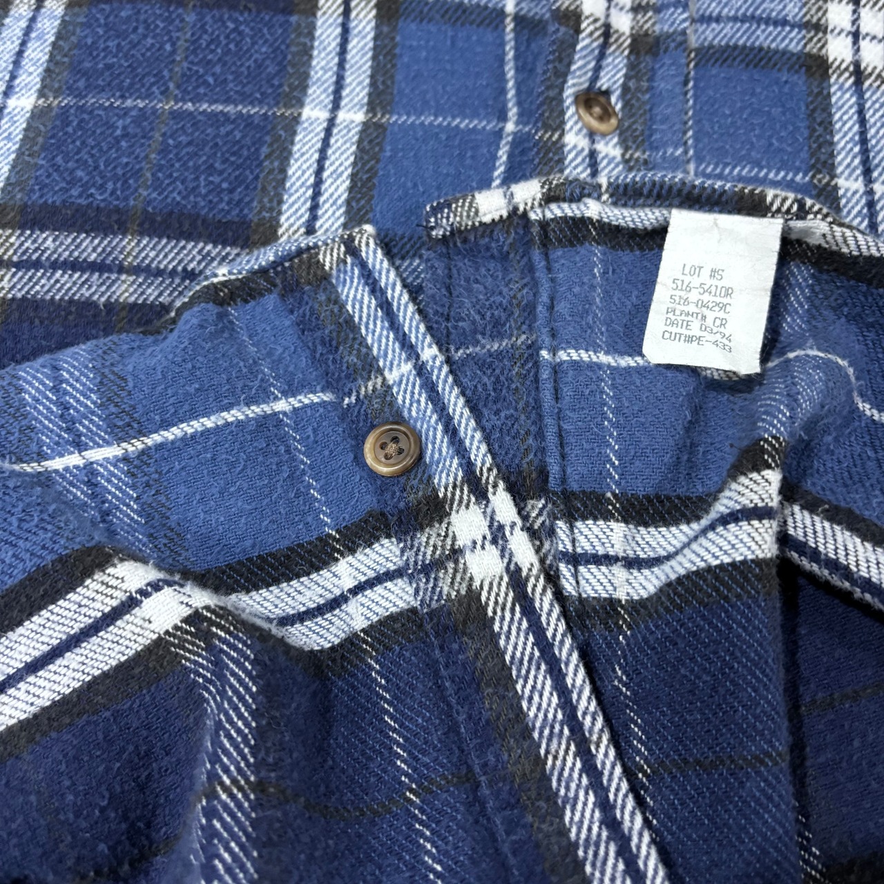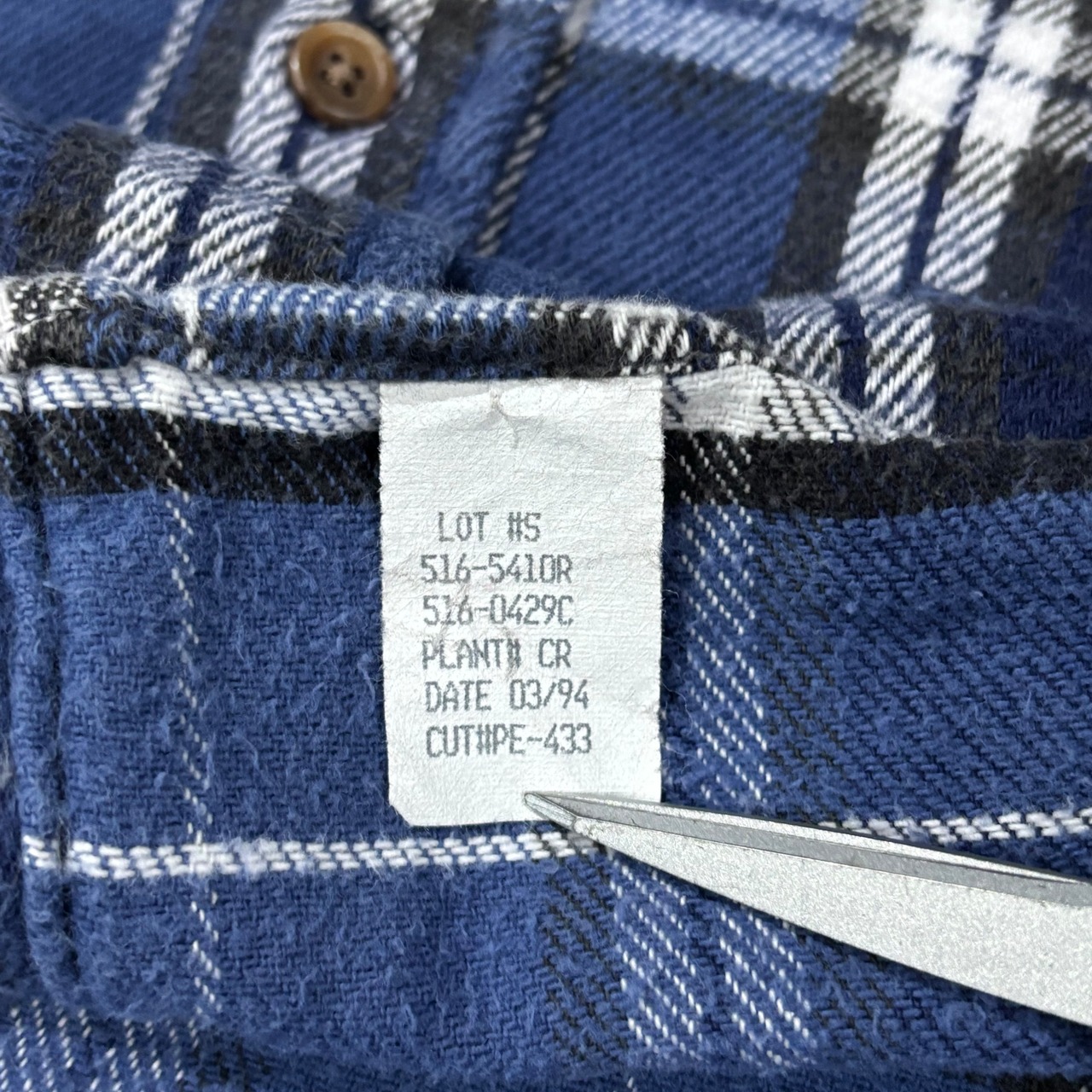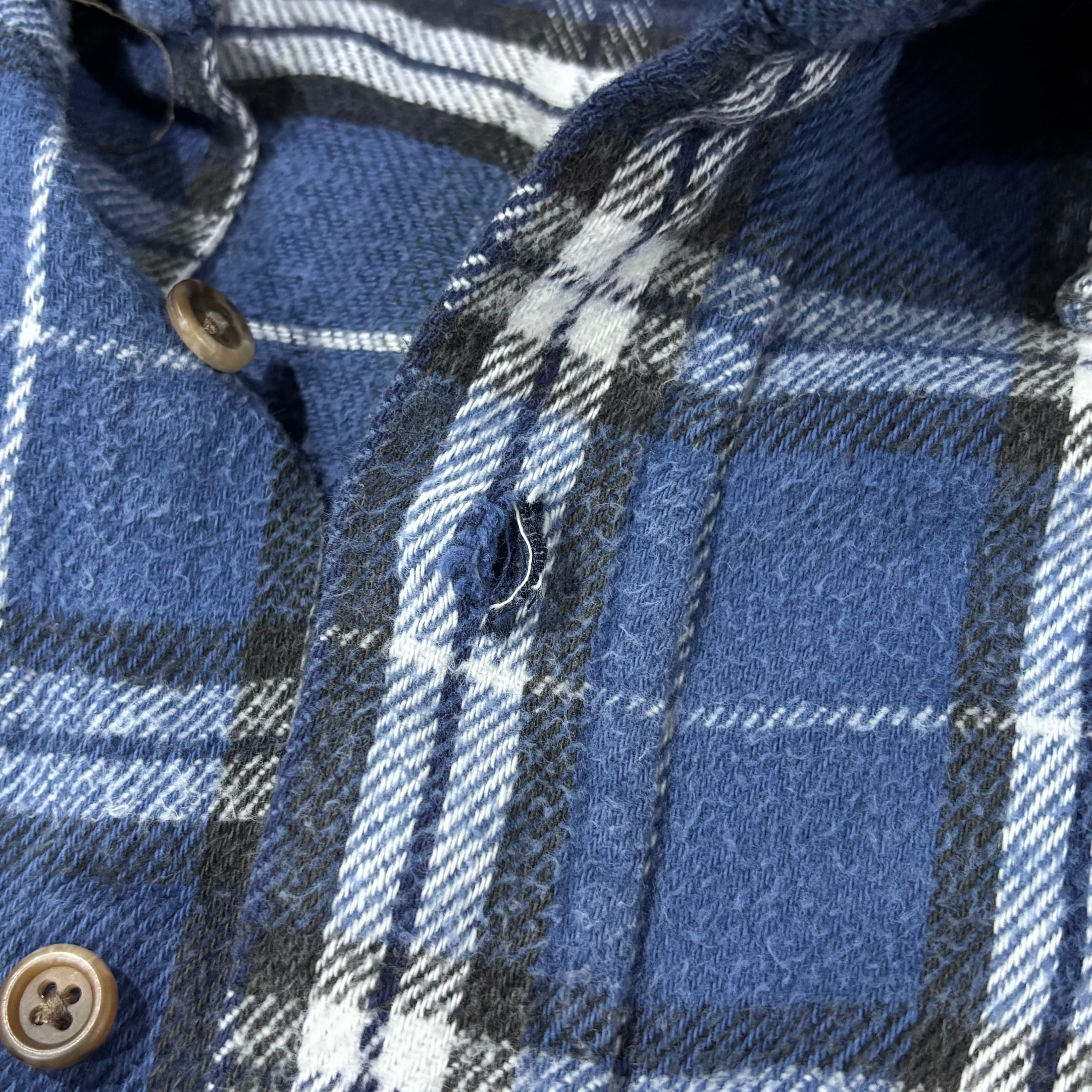 上から2番目のボタンホールにほつれあり