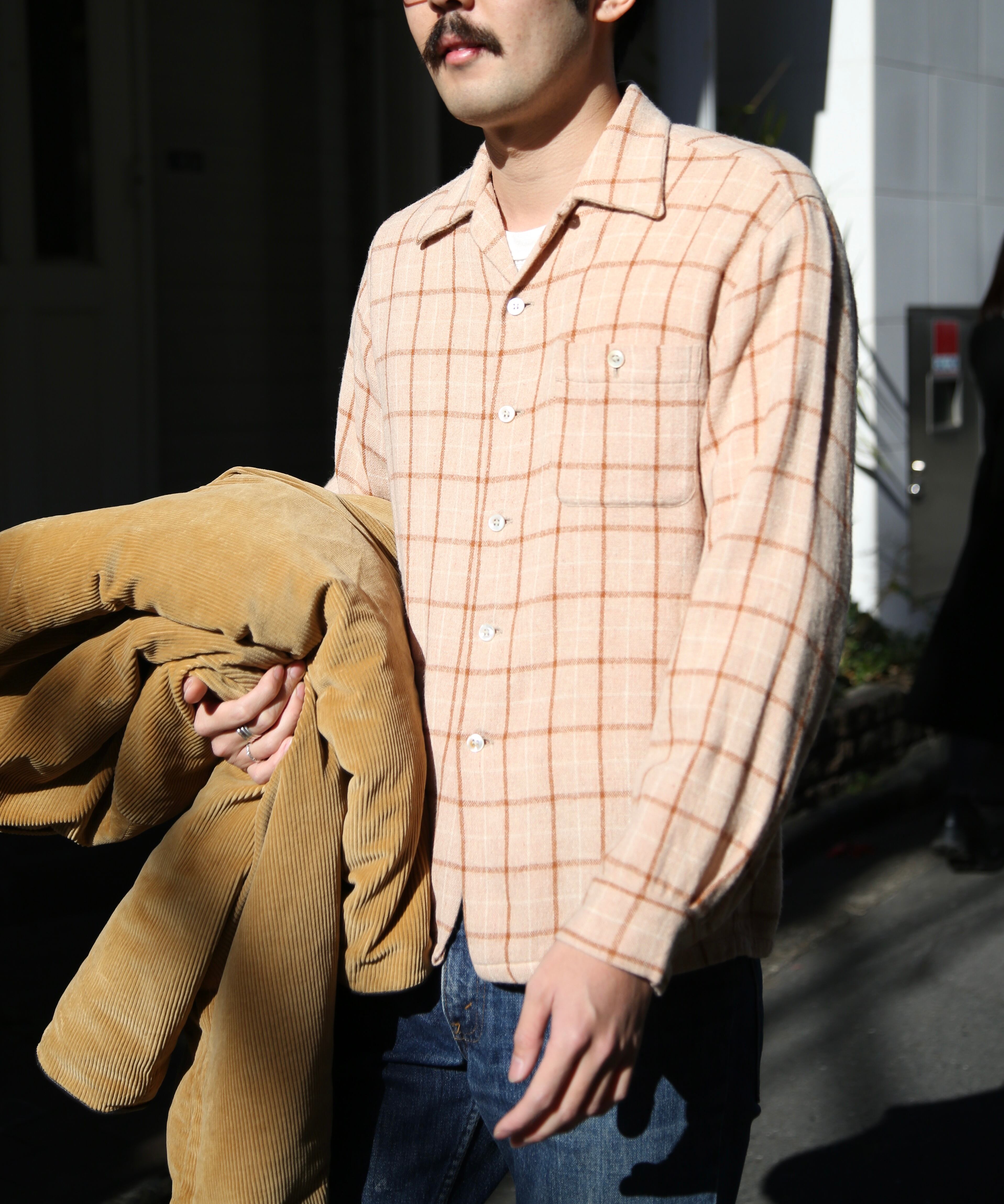 柔らかいカラーリングのチェックシャツ